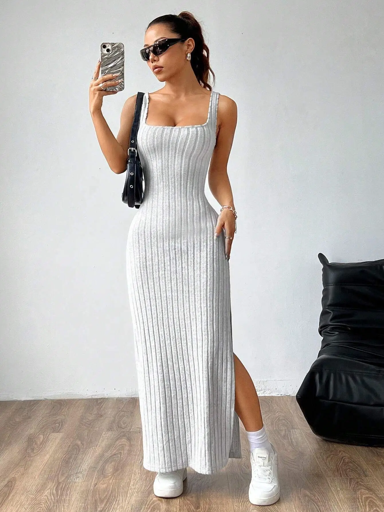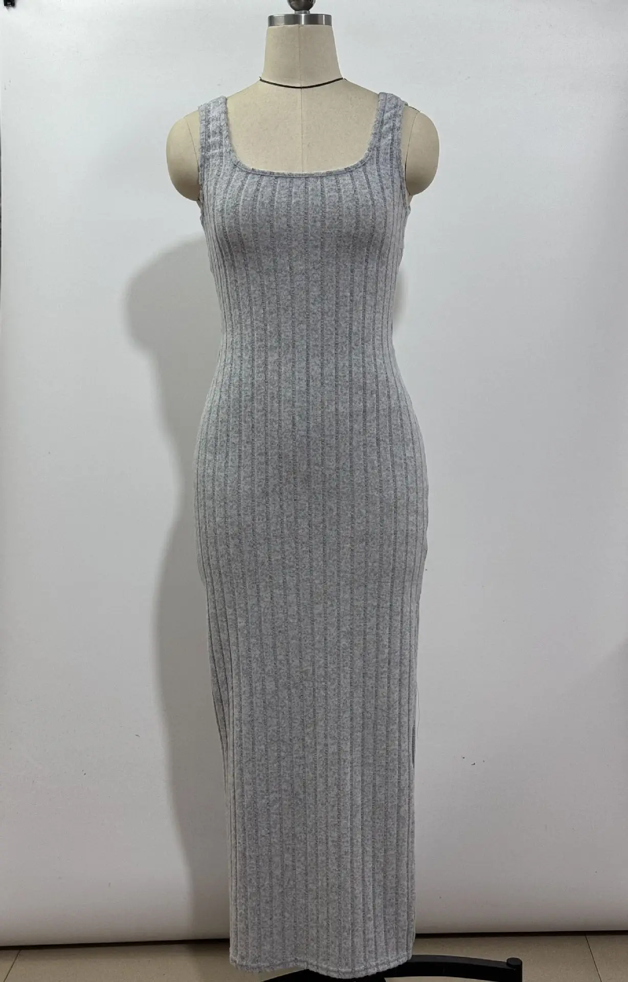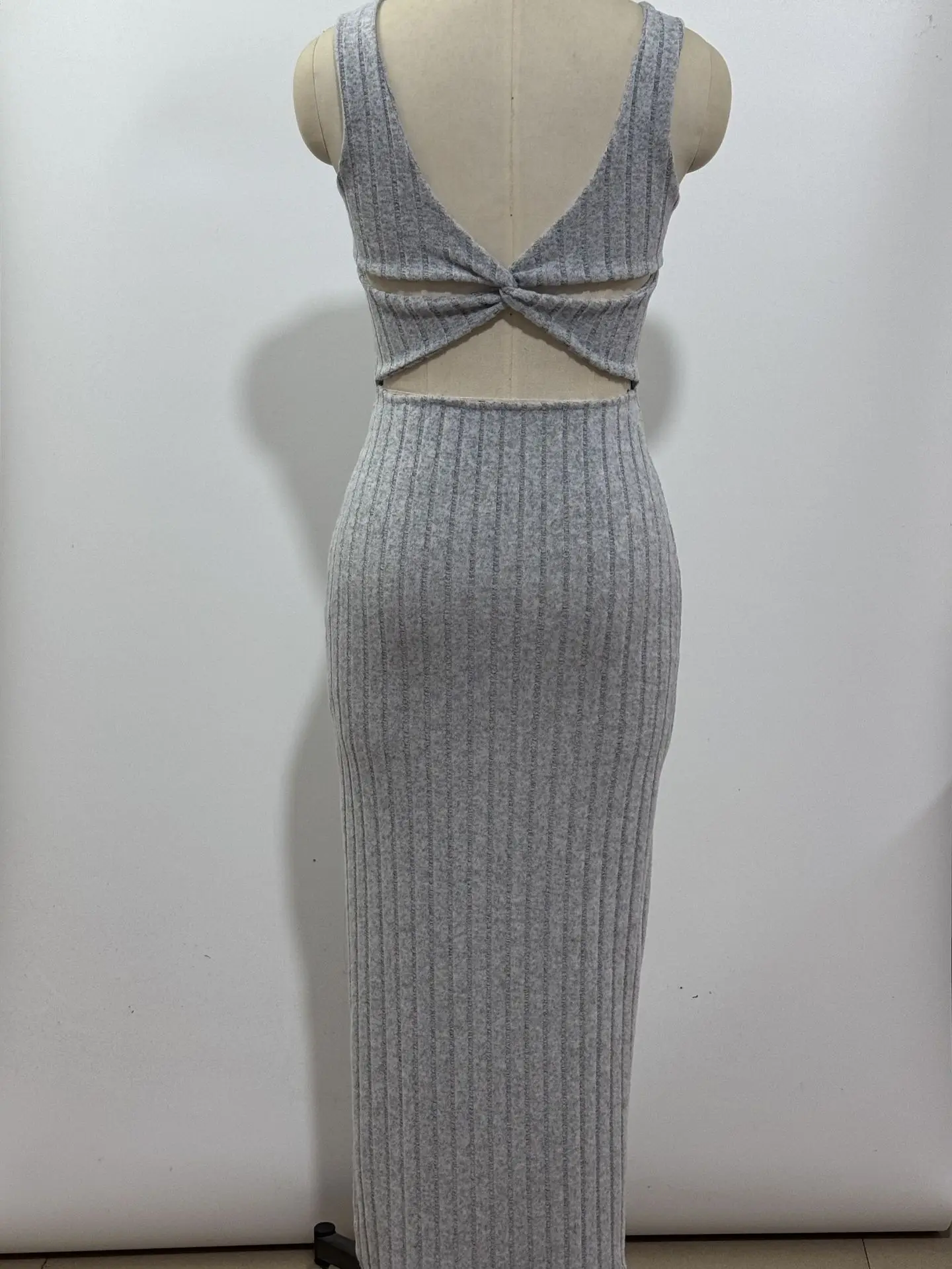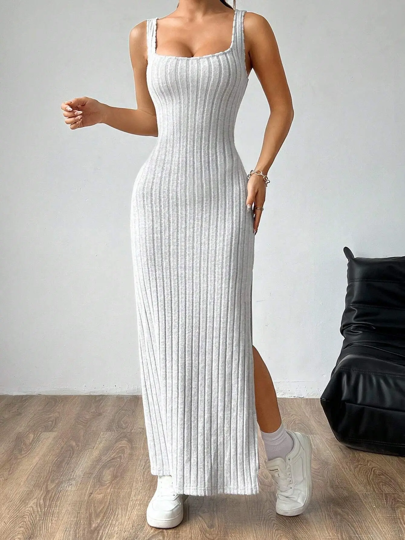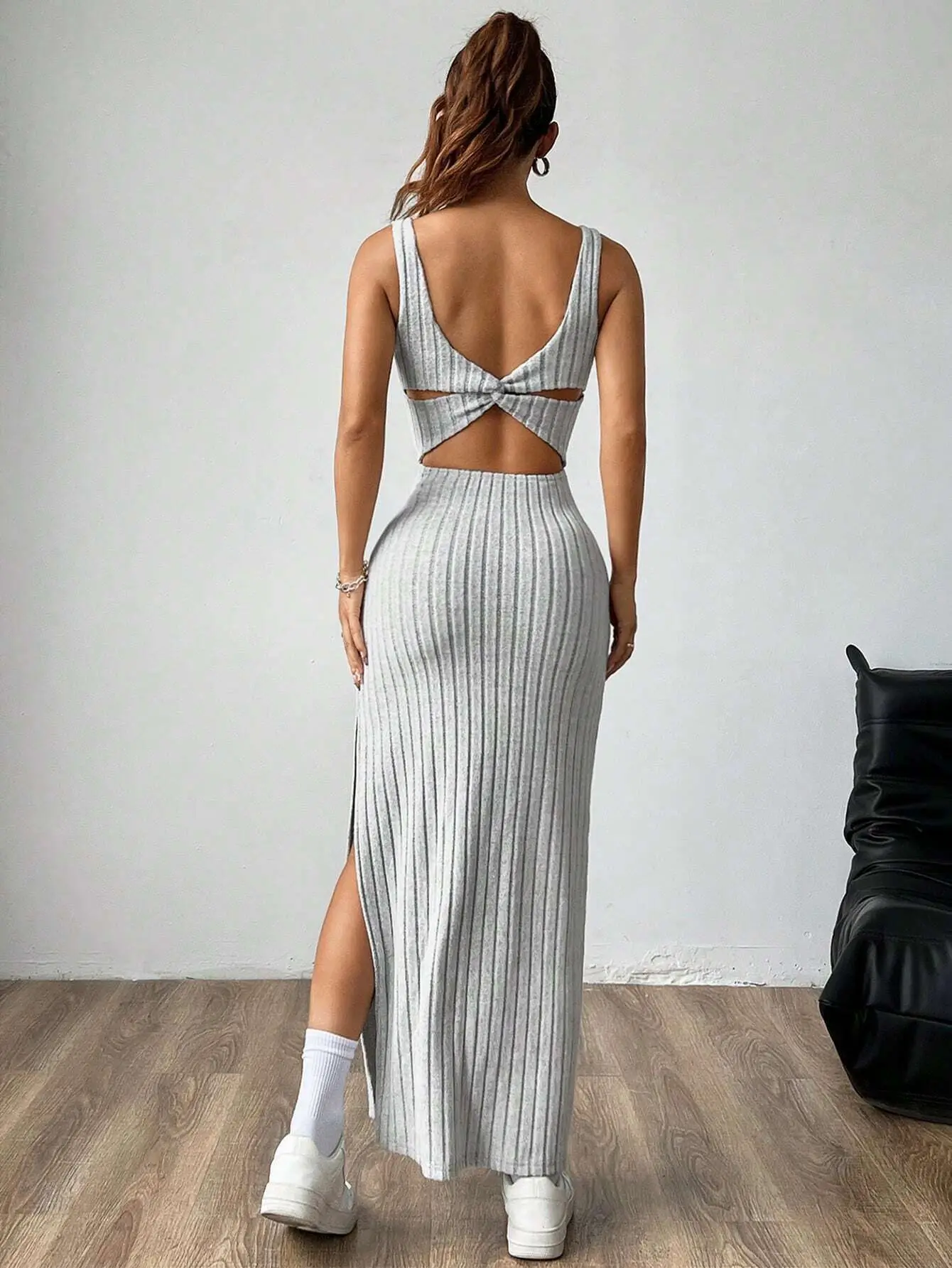Turn heads with effortless confidence. This ribbed maxi dress is designed to hug your shape in all the right places, featuring a sleek square neckline, a flattering side slit, and an eye-catching twisted open-back detail.